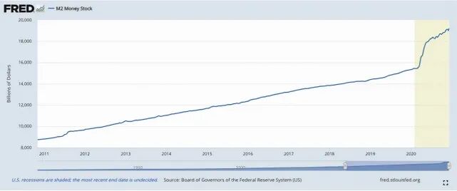 按照摩根大通在一周前发布的最新行业报告中的解释就是,美国当前的货币和财政刺激举措正在成为世界各地去美元化的催化剂。最重要的是,目前美联储仍在以每月1200亿的规模在购买基础债券,如果按美国货币基数10倍测算,那么这1200亿基础流动性转换成M2将变成1.2万亿美元的规模,下图这根M2大直线完美的诠释了这个过程。