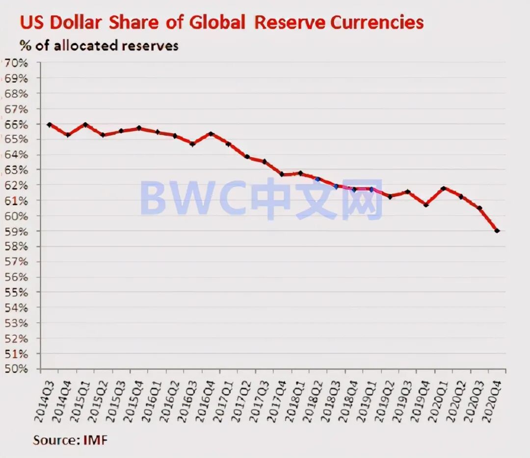 对此,盛宝银行分析认为,在越来越多美元被注入市场过程中,引发美元贬值的蝴蝶效应会使美元储备地位下降。进而,亚洲可能会创建出现新的储备货币,新货币将开始把美元排挤出地区贸易。值得注意的是,据国际货币基金组织(IMF)公开的最新数据显示,美元储备份额已经意外地从2000年时的73%下降至25年来最低至59%。而近期的多个迹象表明,美元储备和流通地位都面临着冲击,无独有偶,事情又有了最新进展。