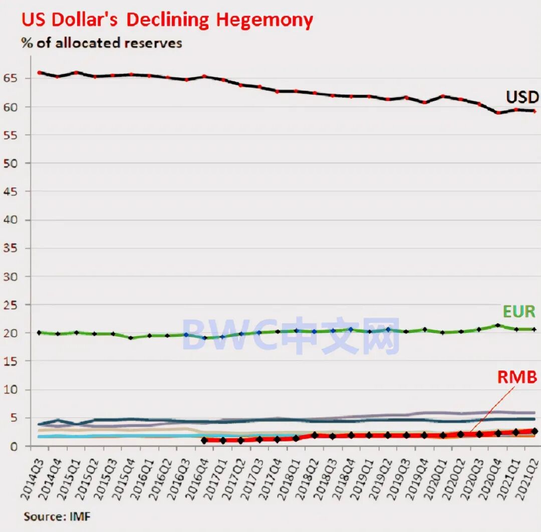 众所周知,美元自从和黄金脱钩后进入信用纸币时代,美元霸权实质上是步入了持续衰退的历史进程中,同时,对世界的影响和掌控能力也出现急速下滑。据IMF在10月1日公布的全球外汇储备数据显示,美元2021年第二季度在全球外汇储备中的占比再次下降至59.2%(第一季度为59.5%),跌至25年以来的最低值,而2000年时该比例还高达73%。