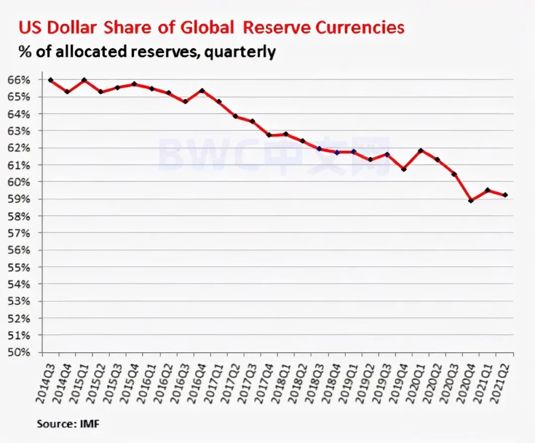 如下图,据国际货币基金组织(IMF)10月公布的最新数据显示,美元第二季度在全球外汇储备中的占比已经下降至59.2%,这比本世纪初时的73%,已经累计下跌了14%。而全球多家央行对于主权加密货币的开发方兴未艾,这也加速了美元流通地位下降的趋势。这也是沙特经济格外重视的。