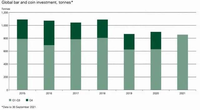 第一个新进展是,据世界黄金协会在11月19日发布的最新展望报告中指出,2022年黄金需求将提高,2021年7至9月,全球央行净买入黄金也高达69吨,尽管全球央行在第三季度的购买量一般,但相比2020年,2021年央行购买量相比仍明显增加,正如由世界黄金协会提供给我们的下图数据所示,2021前三季度全球金币金条总需求创下2013年以来最高水平至867吨。