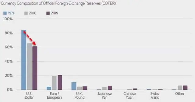 全球外汇储备中美元的市场份额不断下降