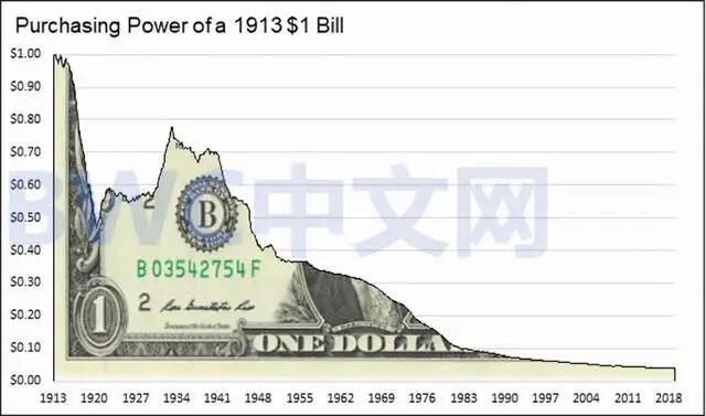 因为,美元在零利率的位置上已经维持了很久,现在名义利率更是负值了,美元的货币和支付地位,已经被严重削弱,美元购买力持续崩溃,下图数据由圣路易斯联邦储备银行提供。