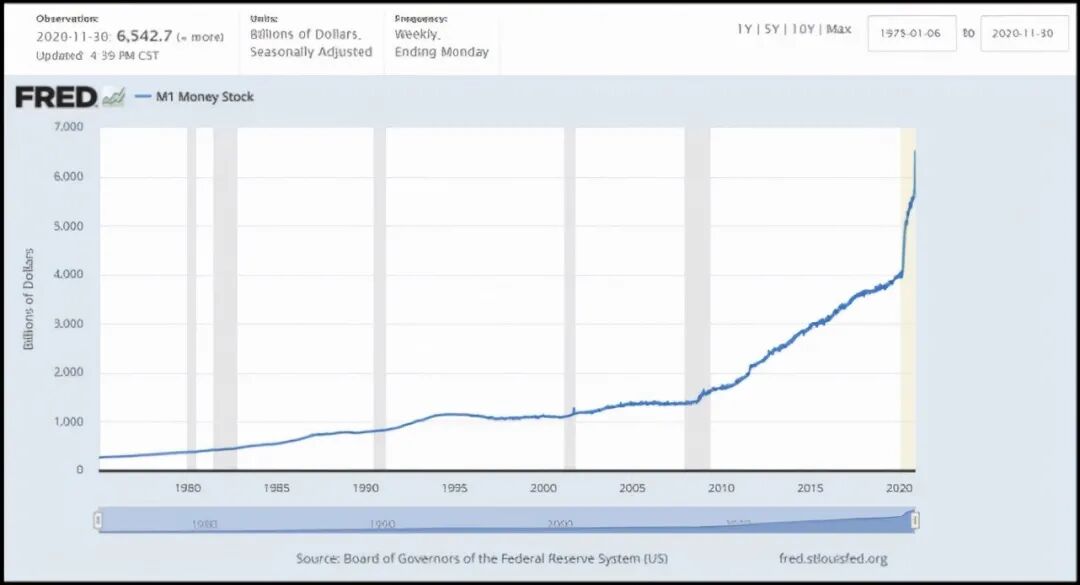 我们查询美联储和美财政部网站上公布的数据统计,在过去的一年多地内,M2相比2020年初快速增长了78.5%以上,M1更是增长了26.1%,这也就是说目前世界市场中流通的美元现金有四分之一是在此期间印出来的,自2020年3月新冠状病毒蔓延以来,美财政部和美联储已经在短短的78周内总计放水印钞了达32万亿的各类美元流动性、M1、M2和一揽子经济刺激方案和债务赤字。