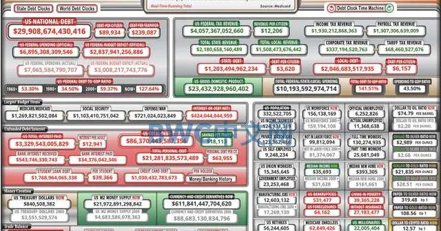 1月30日,在下面这个像飞机仪表盘样的美国联邦国债实时钟上显示的债务赤字总额已连跳三级触及30万亿美元大关,且债数据还在实时增长中,相较1989年里根发表离职讲话时更是增长了7倍还多。
