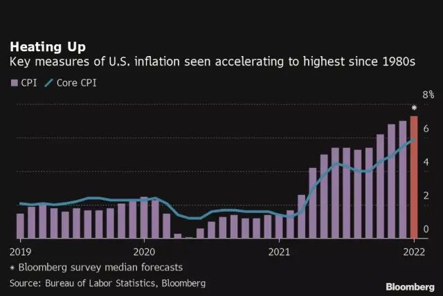 彭博社在2月6日公布的一项调查显示,美国劳工部在2月10日将公布的1月CPI料将同比上涨7.3%(前值为7.0%),创下1982年初以来最大涨幅,但我们注意到,现在和1982年有很大的不同。目前通胀指数正在飙升,而且一个月比一个月更糟,按照通胀惯性,高通胀还没有见顶,预计2022年上半年的CPI数据仍将维持在7%的高位。