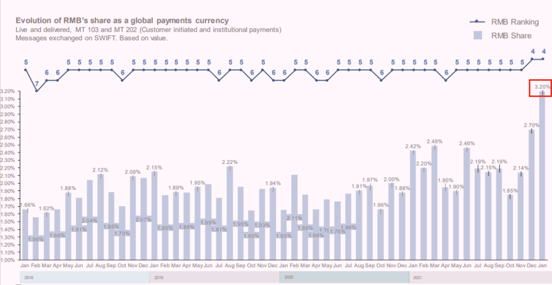 目前,在人民币国际化不断更上层楼的背景下,也间接地提高了人民币的国际使用流动性和货币当局增加人民币的储备和使用频率,据SWIFT在2月16日公布的最新报告显示,1月,人民币在全球支付排名中继续维持在全球第四位,所占份额持续从去年12月的2.7%大幅升至3.2%,创下历史新高,这说明人民币的国际化进程正在不断前进,人民币资产在全球央行、国际投资者和跨境消费者中越来越受欢迎。