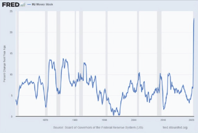 自2020年2月以来的25个月中,我们据美财政部及美联储网站公布的数据统计发现,美国在此期间总计宣布印钞放水了34万亿美元的基础货币流动性(M1,M2等)、资产负债表的购买、增加财政债务上限、2022年度的预算赤字和一揽子经济刺激方案等,下面的这条直线完美诠释了这个过程。