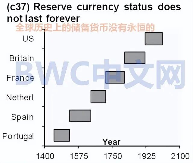 高盛提到正是因为50多年前英国爆发的债务危机才使得市场开始远离当时作为全球主要储备货币的英国货币,此后越来越不愿意持有,一直到英镑的地位被美元所取代(具体细节请参下图)。