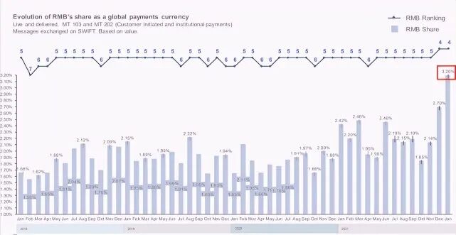 另据SWIFT在2月16日公布的最新报告显示,1月,人民币在全球支付排名中继续维持在全球第四位,所占份额持续从去年12月的2.7%大幅升至3.2%,创下历史新高,这说明人民币的国际化进程正在不断前进,人民币资产在全球央行、国际投资者和跨境消费者中越来越受欢迎。