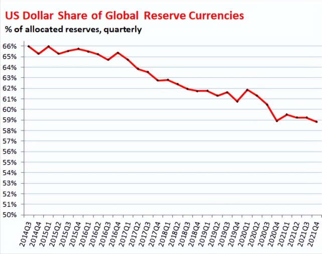 据IMF在日前最新公布的全球央行官方外储货币构成(COFER)报告显示,2021年第四季度,美元在全球央行国际储备中的市场份额从上一季度的59.15%进一步降至58.81%,创下26年以来新低,且为连续第三个季度下降,请注意,2001年美元该比例还高达71.5%(欧元正式以纸币和硬币的形式出现之前),而在1977年,美元的份额高达85%。