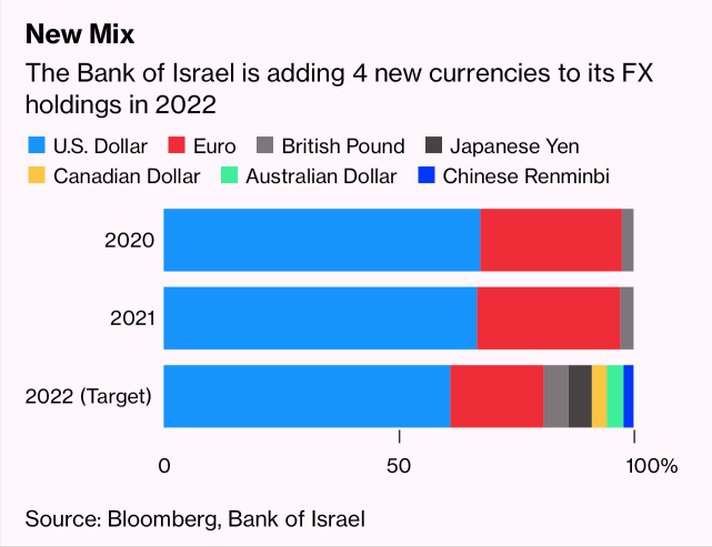 比如,据彭博社在4月22日报道称,以色列央行进行十多年来最大调整,首次将人民币纳入其外汇储备中,以色列央行在3月底公布的年度报告表示,该国首次在2000亿美元的外储中增加人民币的份额至2%。