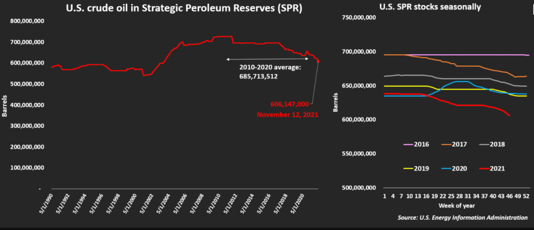美国战略石油储备(SPR)中的美国原油(左图),美国SPR季节性库存(右图)