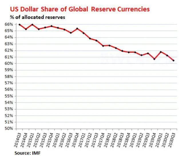 事情的又一个新进展是,国际货币基金组织(IMF)的最新数据,2020年第三季度,全球央行(美联储除外)持有的以美元计价的外汇储备的全球份额(美国国债,美国公司债券,美国抵押贷款支持证券等)下降至60.5%。这是自1995年以来的最低水平。在过去的六年中,美元所占的份额以每年约1个百分点的速度下降: