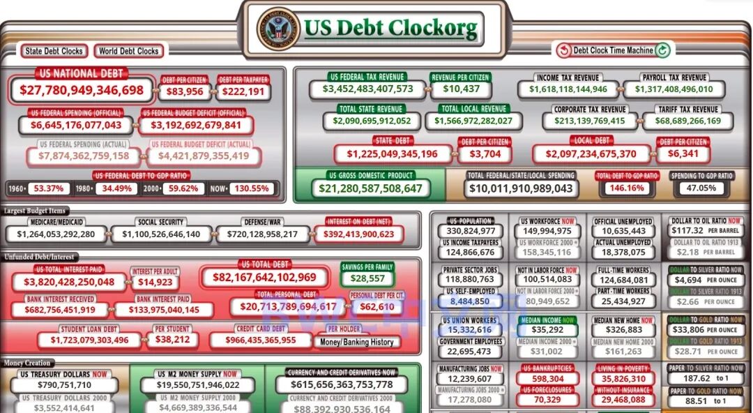 1月12日,在下面这个像飞机仪表盘样的美国联邦国债实时钟上显示的债务赤字总额已连跳三级超过27.7万亿美元大关,且数据还在实时增长中,我们注意到,这相较里根发表离职讲话时增长了11倍还多,高盛预测,仅2021财年的美国财政的预算赤字就突破5万亿,比如,现在美国正在计划在接下来推出数万亿美元的刺激计划。