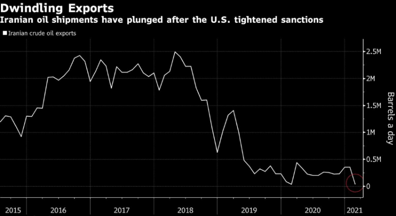 通过下图,我们可以清晰地看到,在美元对伊朗石油交易进行限制过程中,伊朗的公开原油运输量在2018年初达到每天约250万桶后逐渐减少,甚至已经接近于“冰点”。这对一个高度依赖石油出口的市场而言,对其经济的冲击是可想而知的。而就在这个时候,事情又有了新的变化。