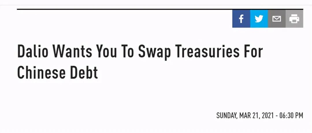 另据美媒3月21日以题为"达里奥请您将美国国债换成中国债券"报道称,达里奥表示,投资者抛售美国国债,购买中国债券,是“经典”周期的一部分。达里奥进一步称,当前的市场环境中,全球央行和其他国际投资者持有美国国债的三分之一以上,而中国债券仅占6%。显然,未来增持中国债券的比例将有很大上升空间,全球大量资金将持续流入中国。