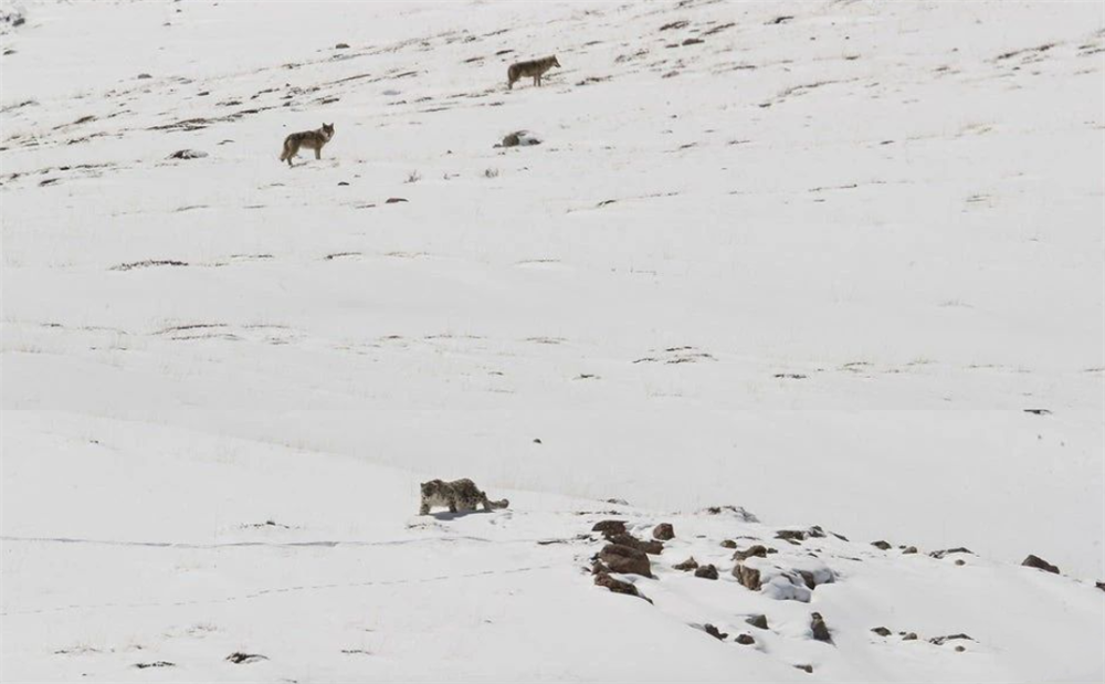 于是就有了这一幕,雪地里雪豹与2只狼对峙着,不远处的山坡上,还有2只狼徘徊着。近处的2只狼,偶尔走动几步,可是一直不敢发起攻击。