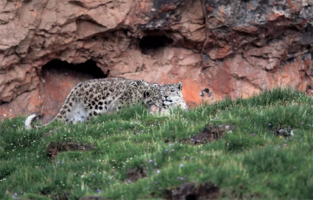 直到一个多月过去,终于有一只公雪豹翻越山岭,出现在“丹吉尔”面前。两只雪豹,双向奔赴,看对方都挺顺眼,整日待在一起。
