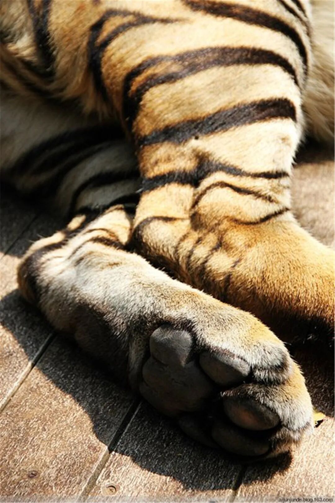 脚趾前端长有尖锐的虎爪,可自由伸缩。行走或奔跑时,爪子通常就会缩入爪鞘里;每当捕猎时,前爪就会露出来,非常灵活,能够牢牢地抓住猎物的身体。