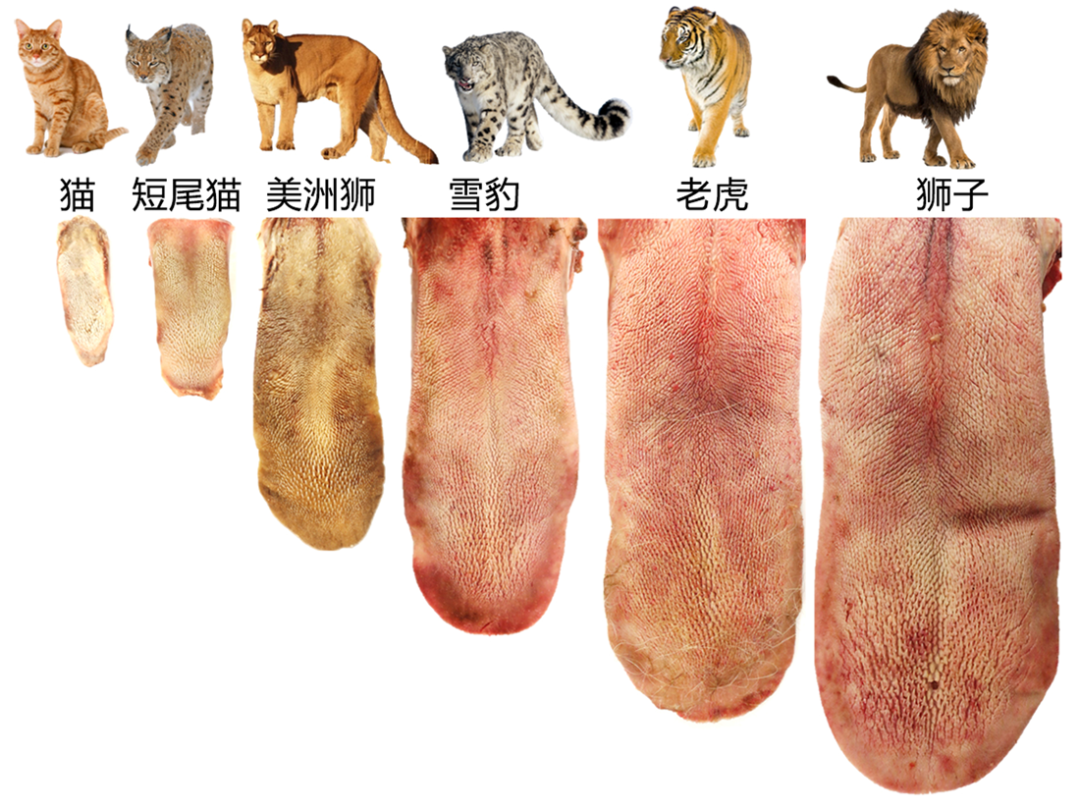 成年东北虎的舌头长约30厘米,正面长满角蛋白构成的“倒刺”,它们是由无数角质化的细胞构成,非常坚硬,其质地成分与指甲盖相似,而且这些“倒刺”较长,还比较尖锐。