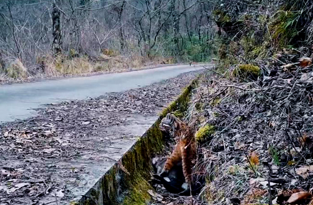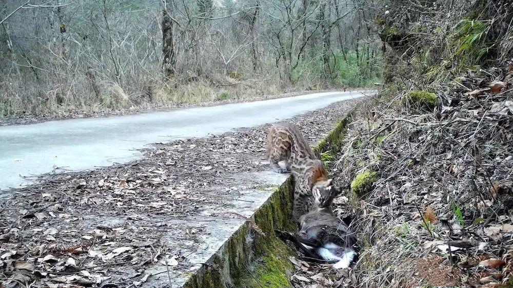 在摩天岭山脉的老河沟,“山彪”栖息在人迹罕至的深山里。一只花斑色的雌性“山彪”,为了追踪一只毛冠鹿,来到了公路附近。红外相机记录下“山彪”捕食毛冠鹿的过程!