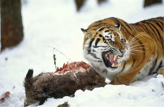 它们最常用的方法就是偷鸡摸狗。东北虎向来就有藏食的习惯,喜欢把吃不完的猎物藏在雪地里,等找不到猎物的时候再拿出来吃。苏里棕熊对东北虎的习性太熟悉了,等到东北虎前脚刚走,它就后脚跟来,挖出剩余猎物来吃个痛快。