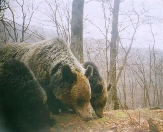 突然,母熊貌似听到了响动,也许是发现附近有人,立马警觉起来,转身带着幼熊快速向森林深处跑去。