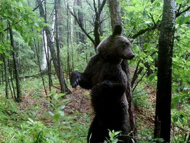 除此之外,在大兴安岭密林深处,还栖息着一种神秘的“人熊”。当地人之所以称它为“人熊”,是因为这家伙在发动攻击时,后肢发力,全身直立,还挥动上肢乱舞,活脱脱像个人一样。当然了,它有如此高的知名度,主要是沾了东北虎的光。