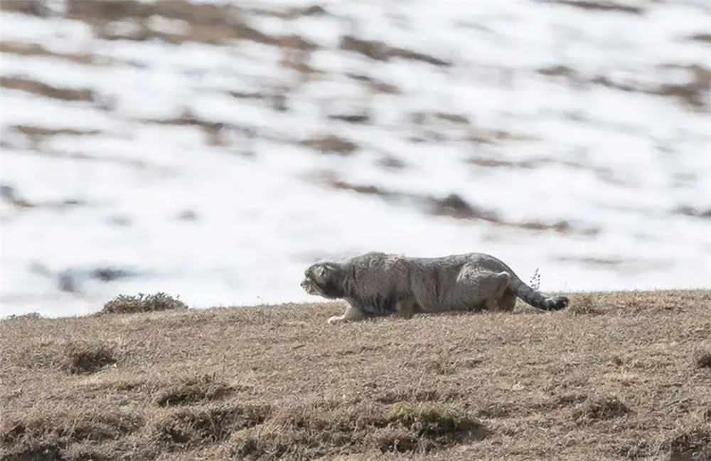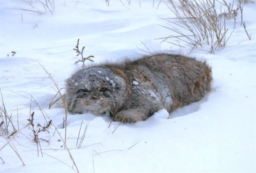 四肢缩短,几乎埋在积雪里了,可兔狲却能慢慢移动,身后留下一道雪痕。当距离足够近时,兔狲才冲了出去,瞅准一只沙鸡就逮住。