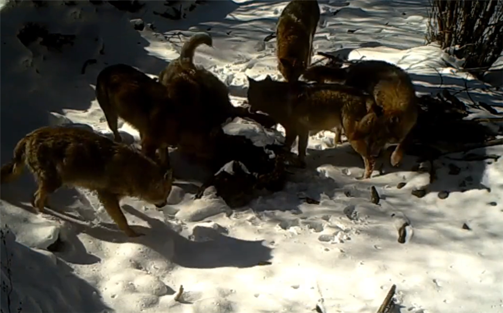 狼群吃饱之后,没有马上离开,而是在附近散漫地走动着,有的干脆躺在地上休息。但过不了多久就要走了,狼群很快就集中到一起,准备离开。
