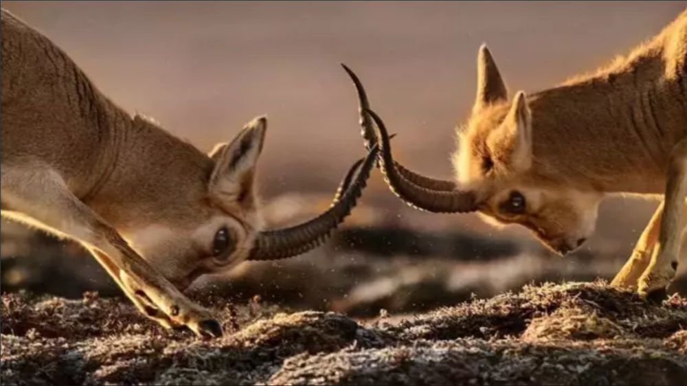 春天的水大部分还没有解冻,只有几股细流,映着可可西里一如既往湛蓝明澈的天空。一群披着棕黄色的绒毛的藏原羚出现在河边,其中有1只雄藏原羚正在向雌性求爱,正准备用身体与雌性耳鬓厮磨。