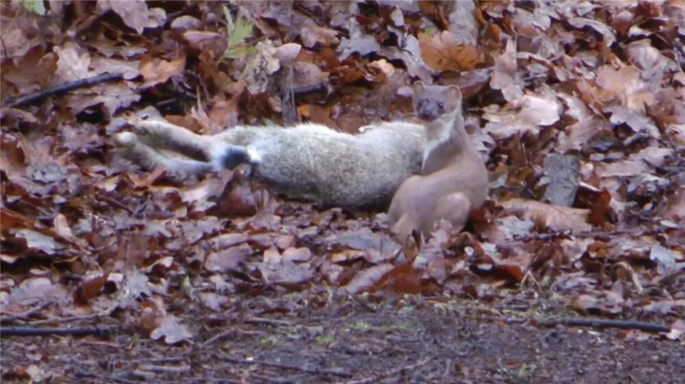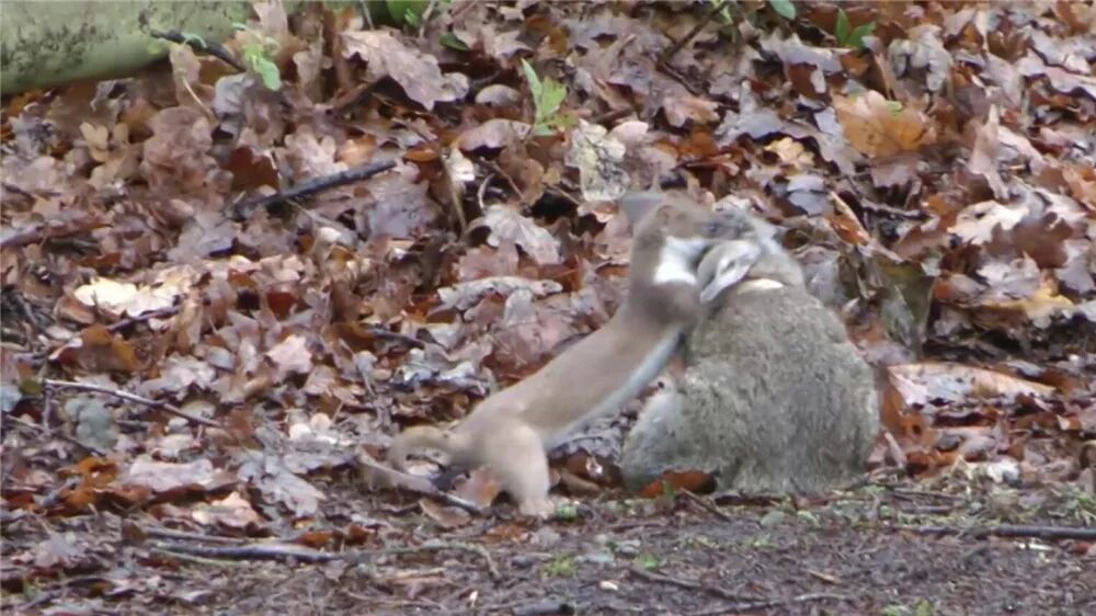 这只黄鼠狼看到人站在旁边,丝毫不予理会,当面上去抱住了这只死掉的兔子就要往回拖拽,黄鼠狼的身材看上去要比这只野兔子小了不少,所以拖拽起来的还是明显能感觉它很吃力!它一边拖动兔子的尸体,一边还要不时的停下来边休息边四处探望,好像是怕有什么其它猎食者一样 ,最后,男子眼睁睁的看黄鼠狼将这只兔子拖进了枯叶旁边的草丛里。
