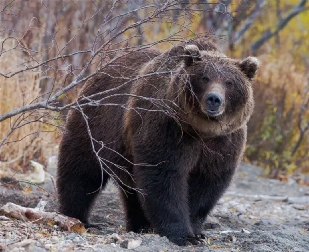 棕熊见母驼鹿不追它了,继续晃晃悠悠地跟在母驼鹿身后,它当然不会这么轻易地放弃眼前这顿美食。不过这次它不用偷偷摸摸,而是光明正大地跟在后面。