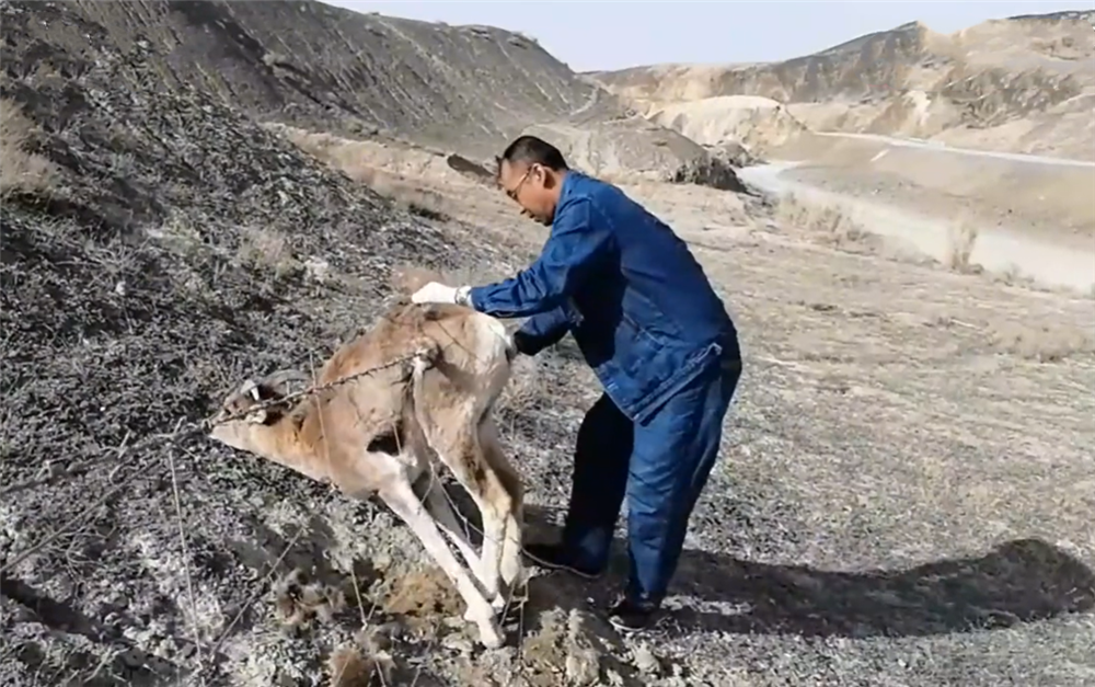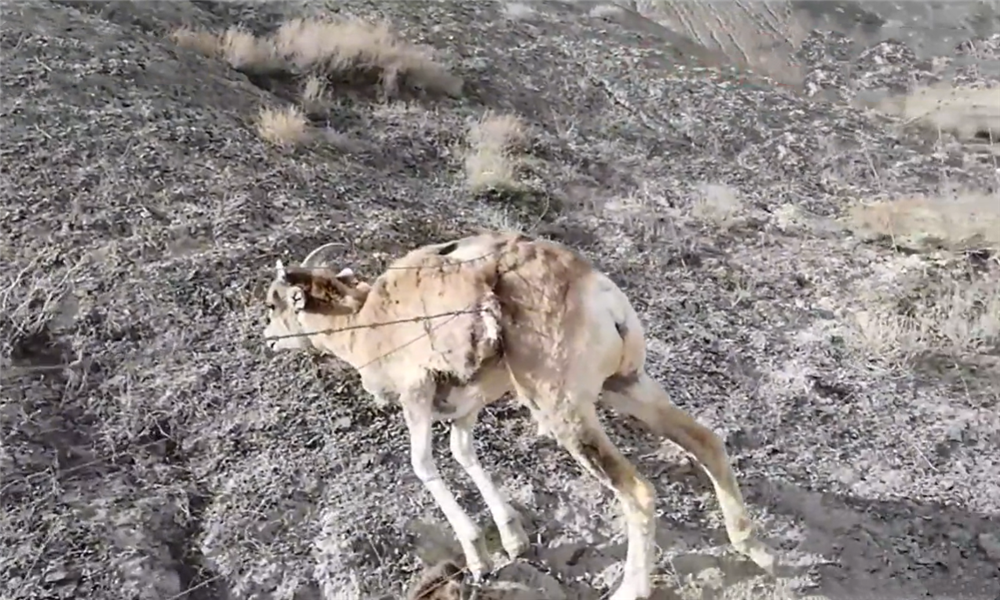 原来盘羊跑到了当地的夏季草场,被隔离带的铁丝网困住了!盘羊的前半身穿过铁丝网,但后半身却穿不过,带刺的铁丝网勒住了它的腹部。