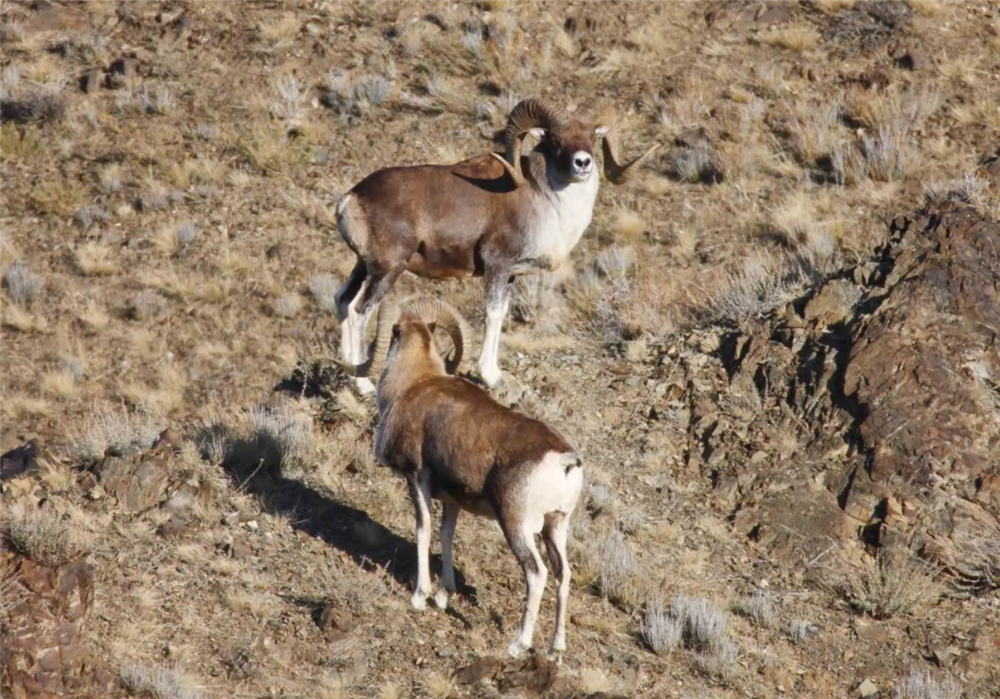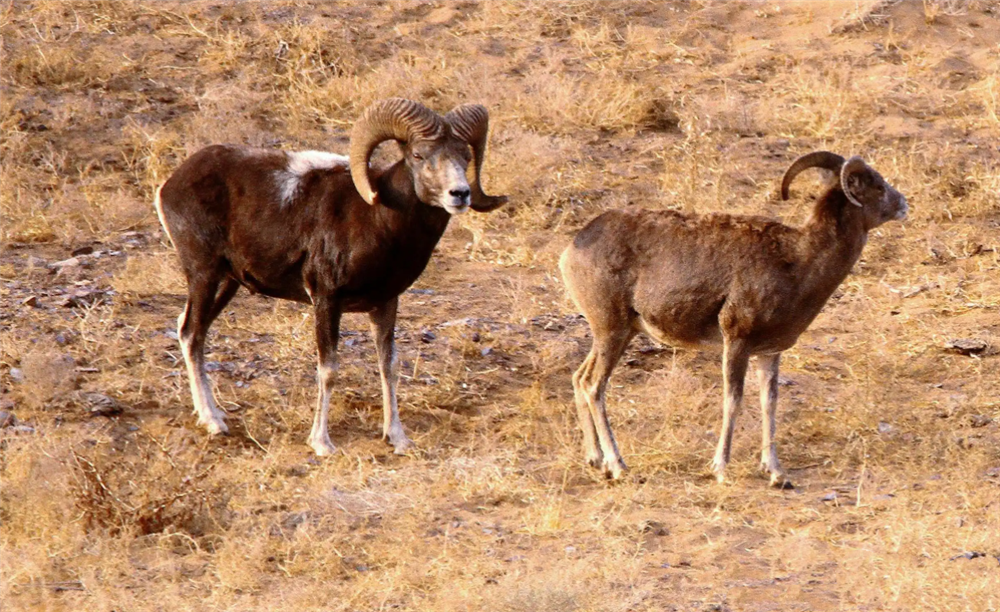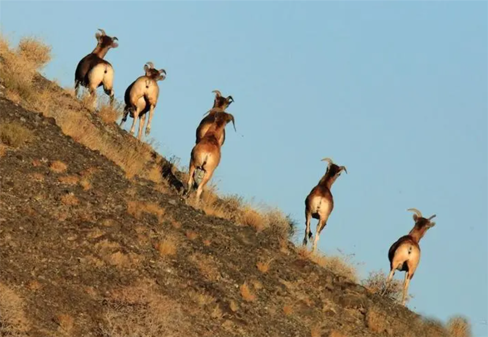 新疆博州精河县地处天山北麓,绵延起伏的山间丘陵上,盘羊成群结队去觅食。盘羊群飞奔的时候,气势恢宏;停下来采食植物时,就像庄严、威猛的“神兽”。