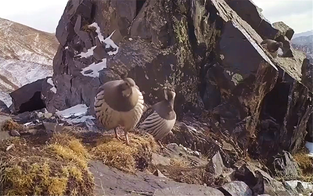 05藏雪鸡沿着岩羊走过的路,来到石山上觅食