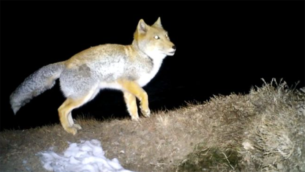 狼也来了!红外相机拍到一只成年狼,身材强壮,精神奕奕,后面跟着一只体型较小的狼,很可能是一对母子。狼都喜欢成群活动,由此可以推测附近一定还有其他的狼,只是没被拍到而已。