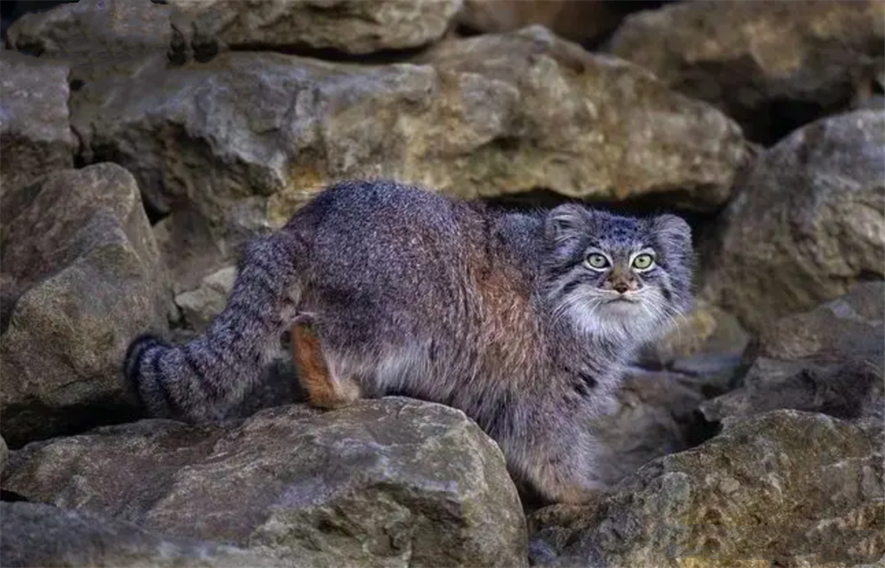 鼠类是兔狲的主要捕食对象,夜晚出动轻易就能捕到足够的食物。但这天,兔狲慢悠悠地来到石山上,左看右看,观察过周边情况后,放下心来,在石山上溜达,显然不是在寻找猎物。
