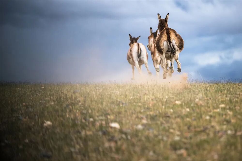 在羌塘无人区里,时不时看见前边有一小群藏野驴,一直在与汽车平行的间隔上相向飞驰。其实,藏野驴就是有股子犟劲,它们看到汽车就想与你赛跑,一比高低,不跳过汽车不罢手。好像在说,在羌塘没有什么动物能跑过我们的。