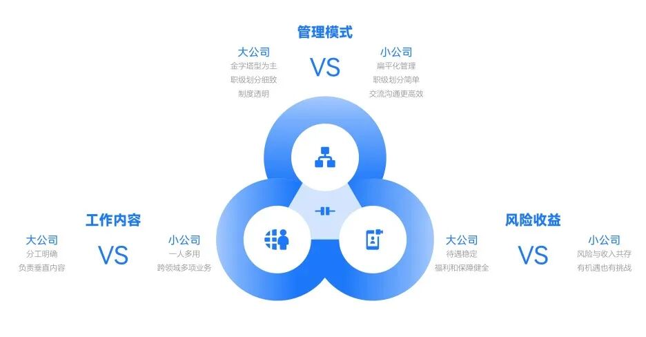 总的来说,想要精进专业技能、职业目标清晰的同学,可以选择进入大公司;如果你想锻炼综合能力,在实战中培养风险意识,中、小型创业公司也是很好的选择哦!
