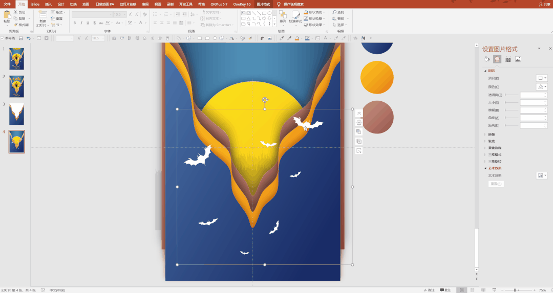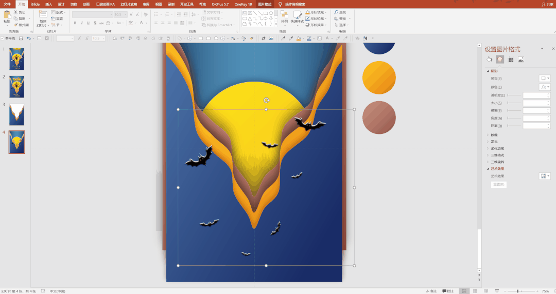 能看到画面中有很多立体的蝙蝠装饰,这种效果用PPT也是可以做出来的。