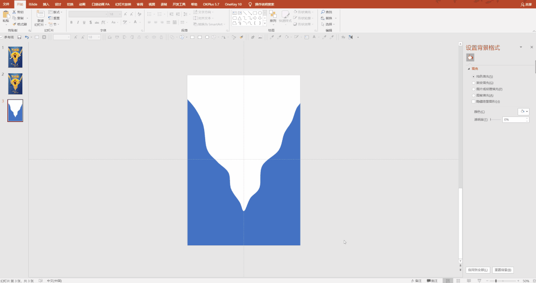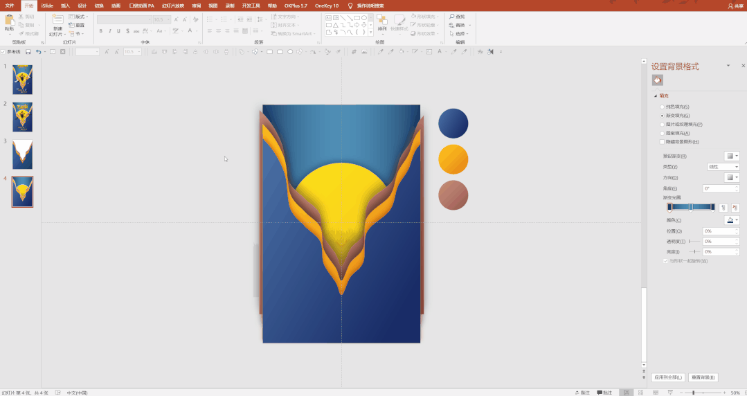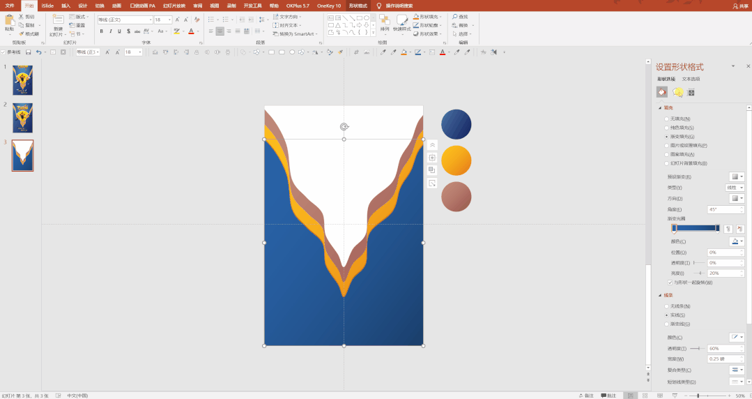 首先,我们利用PPT当中的曲线工具画出自己想要的形状。设置渐变填充,此时需要统一渐变的方向,假定光源位于左上方,调整左侧的渐变光圈,将亮度提升至30%左右。