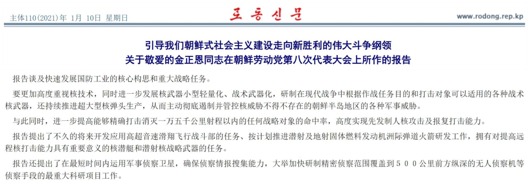 劳动新闻关于金正恩八大报告的报道