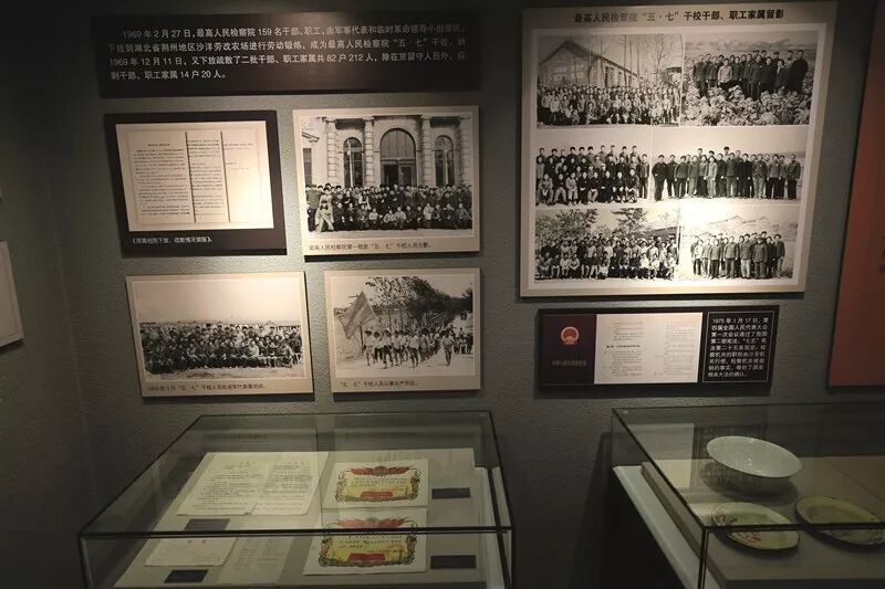 “办公场景”区域展出的是20世纪50年代最高人民检察署(院)的办公陈设。办公桌上的台灯是李六如副检察长使用过的。两只樟木箱和小茶几是张鼎丞检察长使用过的。皮箱是当时高检署检察长及厅级干部出差时使用的。展厅的墙壁上,还挂着数张最高检干部职工在“五七”干校时期的合影,是他们从事生产劳动的照片。(方圆公众号:fangyuanmagazine)