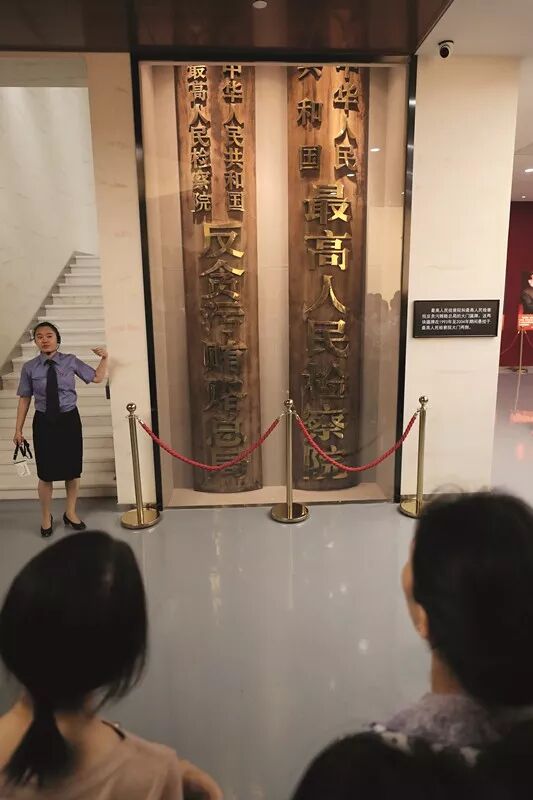 走进一层展览大厅,最高人民检察院和最高人民检察院反贪污贿赂总局的两块大门匾牌挂在一起。这两块匾牌在1993年至2004年悬挂于最高人民检察院大门两侧。
