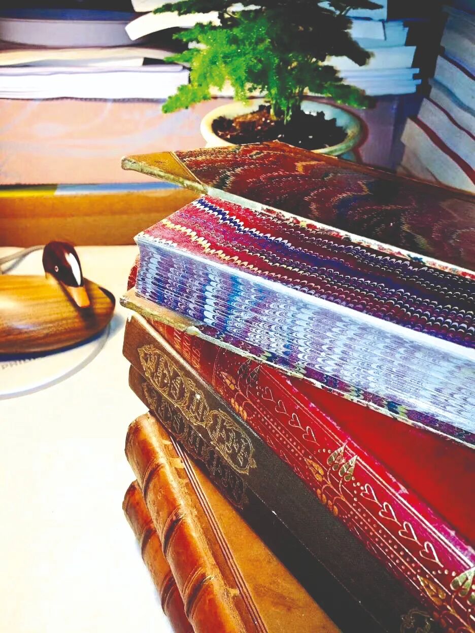 李钦宝的书房不大,但格局紧凑,摆设齐全。在他的书架上,放置着一些他认为杂七杂八的书,仔细看过去,会发现很多书都是西方文学的精装本,也有一些看起来年代久远的线装书籍,其实眼前的这些书只是被他收入囊中的一部分。一些国外名家的签名本、明清古书等贵重书籍,他都专门放在一处收起来了,因为青岛气候比较潮湿,他觉得一些书放在外面不易保存,放坏了的话就太可惜了,很可能再也找不到这些珍藏本了。提到自己喜欢的藏书,李钦宝言语中有抑制不住的喜悦。