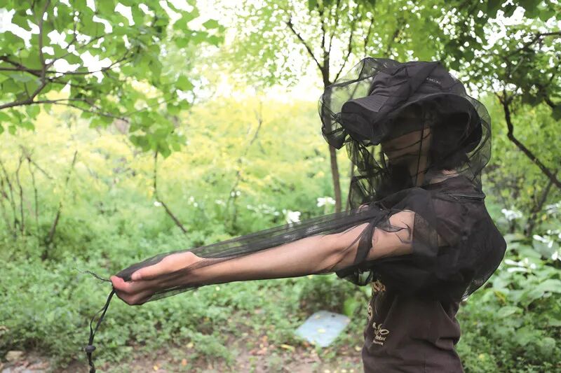 林中蚊虫滋生,进入树林前,陈雁之在胳膊与颈部喷洒驱蚊液,再穿上特意准备的防蚊衣。