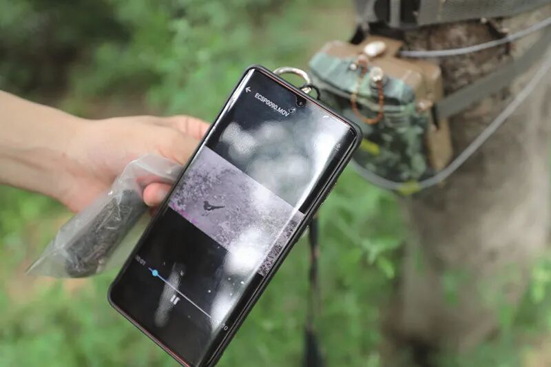 陈雁之使用手机与红外相机相连,查看到一只鸟类活动的影像。