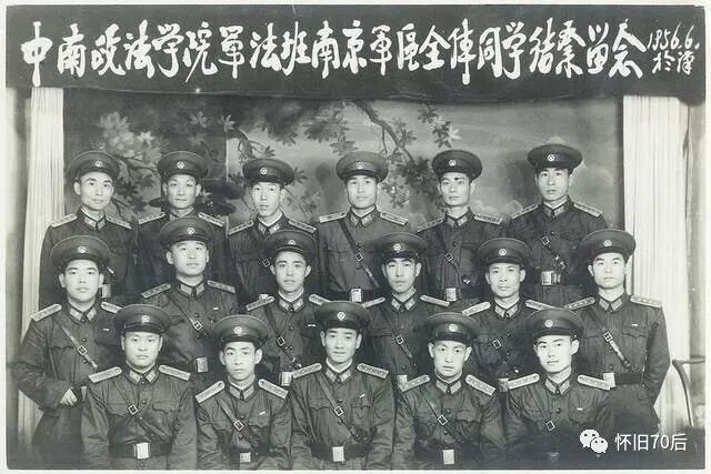 1.罕见的军法班。看到这张合影,可能很难想像这些一身戎装的军人会是我们的校友。可你确实没看错,他们是1956年中南政法学院军法班的学员。在那个法律不健全的年代,军队的条例、规定相对健全,毕竟,作为国家武装力量,必须有严明的军纪。当时,刚实行军衔制不久,一身崭新的55式军装,英武帅气。